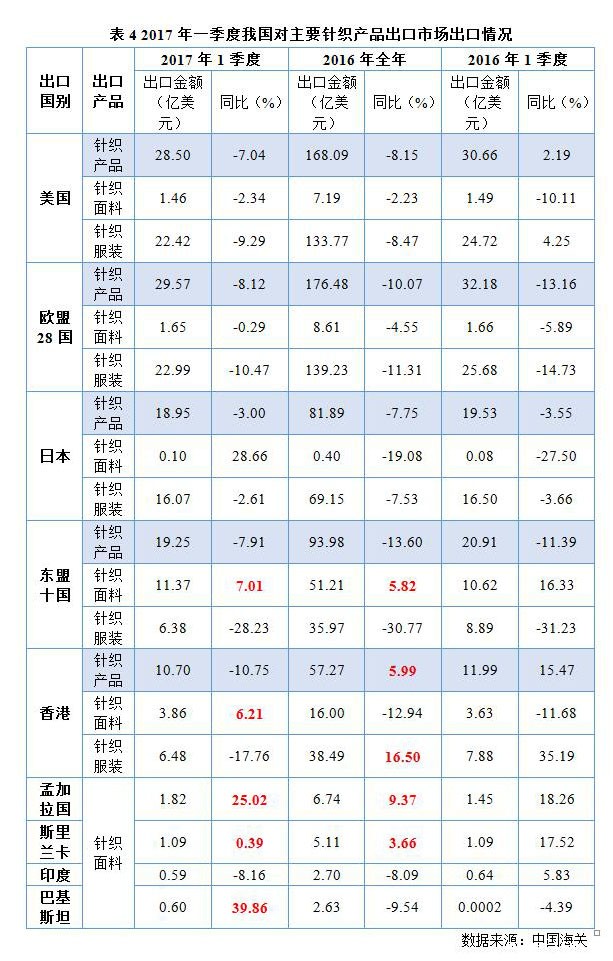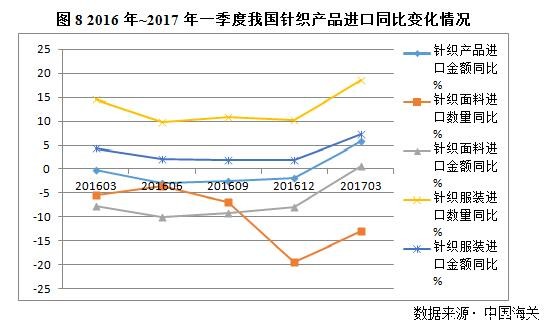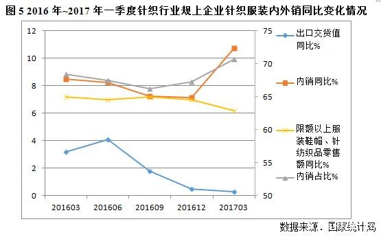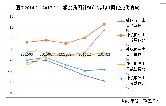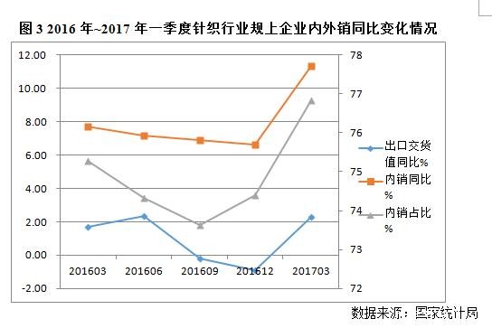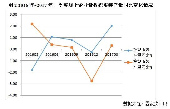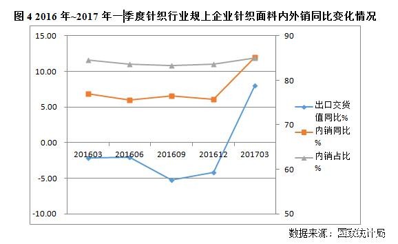 2017年一季度针织行业内销市场领先海外市场回暖,行业投资增速加快,国内经济企稳迹象明显,加之国内消费升级作用进一步显现,内销对行业发展的拉动作用越发重要。一季度海外市场依然没有较大改观,我国对欧美日等国出口持续下行,但针织面料对东盟、孟加拉国、斯里兰卡和巴基斯坦等国家出口明显提速,针织服装产能转移现象明显。