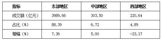 在41家可比样本市场中,东部地区专业市场成交额为3989.66亿元,同比增长7.36%;中部地区专业市场成交额为303.50亿元,同比增长5.00%;西部地区专业市场成交额为220.64亿元,同比下降23.17%。
