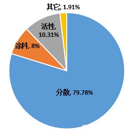 纺织用数码喷墨印花墨水种类丰富,均属于水基墨水,按照着色剂的性质不同,可以划分为分散墨水、活性墨水、酸性墨水和涂料墨水等,其中常用的有分散墨水、活性墨水和涂料墨水。2021年分散染料墨水预计占整个纺织数码印花墨水用量的79.78%,活性墨水占比10.31%,涂料墨水占比8%。