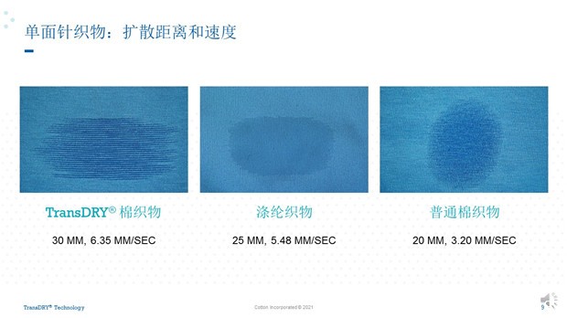 庄德华首先分享了三种在棉质面料上实现湿气管理性能的整理技术。其中,TransDRYTM技术通过将特殊拒水加工后的棉纱与普通纱线交织排列,起到了吸湿、排汗和快干的作用。“该项技术的关键在于纱线处理,可通过不同排纱方式,实现汗液/湿气从横向、纵向到由内到外的单向导湿功能,不同的织物结构会有不同的性能表现。”