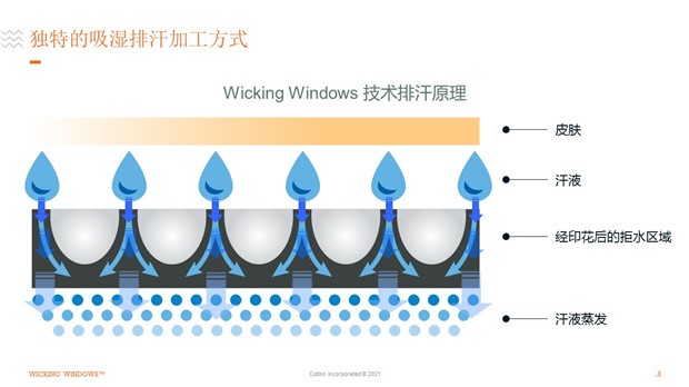 棉的另一项吸湿排汗技术WICKING WINDOWSTM则是在面料反面部分区域以印花方式印上防水剂,通过控制印花浆料的渗透,保证防水剂不接触到面料正面,当水分或湿气通过没有防水剂处理的区域后,即从面料反面传导到面料正面,并在空气中蒸发,从而实现单向导湿。在不同组织结构的面料上,WICKING WINDOWSTM都可以实现迅速的吸水。