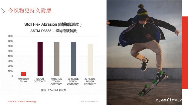 庄德华指出,该项技术采用的聚乙烯软油能够提高面料的耐磨性及撕破强力,交联剂(PBI)则提高了面料的功能耐久性。“对于TOUGH COTTONTM,我们有严格的性能指标,需要处理后的面料经过20次洗烘之后,耐磨程度较处理前的面料提高2倍以上才为合格。”
