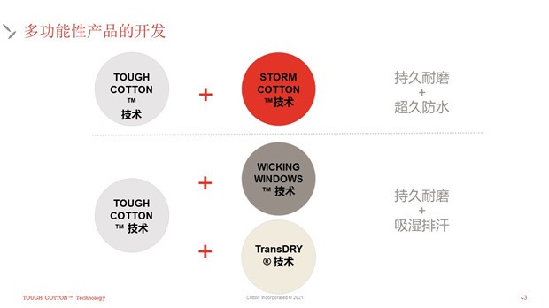 以上介绍的五项功能整理技术还可以叠加使用,以打造具有复合功能的棉产品。比如,将TOUGH COTTONTM与STORM COTTONTM相结合,主推持久耐磨+超久防水的概念,也可将TOUGH COTTONTM与TransDRYTM或WICKING WINDOWSTM相结合,主打持久耐磨+吸湿排汗的概念。庄德华表示,“棉已经不仅仅是大家传统以为的天然、舒适、透气、柔软,在加持各项功能性后,它完全可以变成出得户外+健身,入得公司+派对的全能24小时服装!”