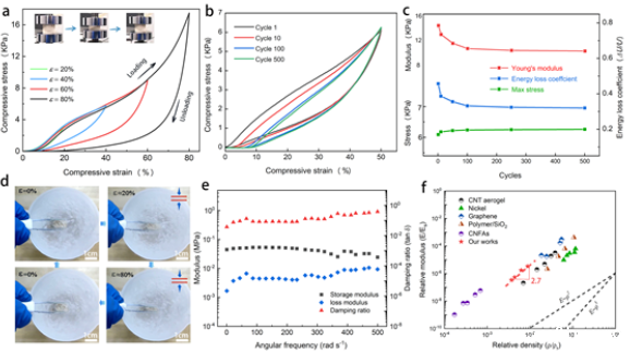 HEKA在受到大压缩应变时表现出优异的弹性,可恢复应变最高达到80%。当压缩次数为500次时,其几乎恢复了原始形状,只有8.2%的轻微永久变形。经过100次压缩循环后,其杨氏模量没有明显下降。此外,HEKAs在超低温(-196℃)下也不会发生脆性断裂和结构倒塌,即使在液氮中浸泡并经过几个压缩周期后,仍表现出显著弹性。