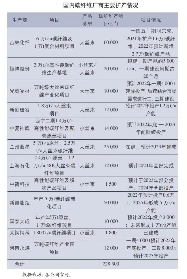 由于风电叶片和其他民用领域对碳纤维用量和低成本的迫切需求,国内碳纤维供应商纷纷进行布局,预计未来几年国内各碳纤维厂家的合计新增产能将超22万t/a,其中大丝束碳纤维的产能合计超12万t/a。