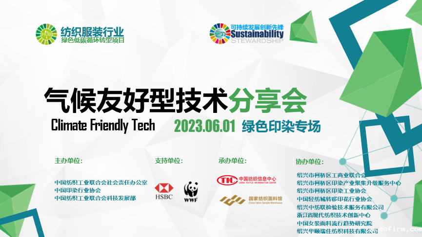 2023年6月1日,纺织服装行业气候友好型技术分享会[绿色印染专场]在绍兴市柯桥区顺利举办。此次技术分享会由伟德app官方正版下载地址社会责任办公室、中国印染行业协会和伟德app官方正版下载地址科技发展部主办,伟德客户端下载平台官网和国家纺织面料馆承办。为推动绿色低碳纺织产业发展、促进产业绿色清洁化转型提供科技支撑,HSBC汇丰银行和WWF世界自然基金会为本次活动提供支持。