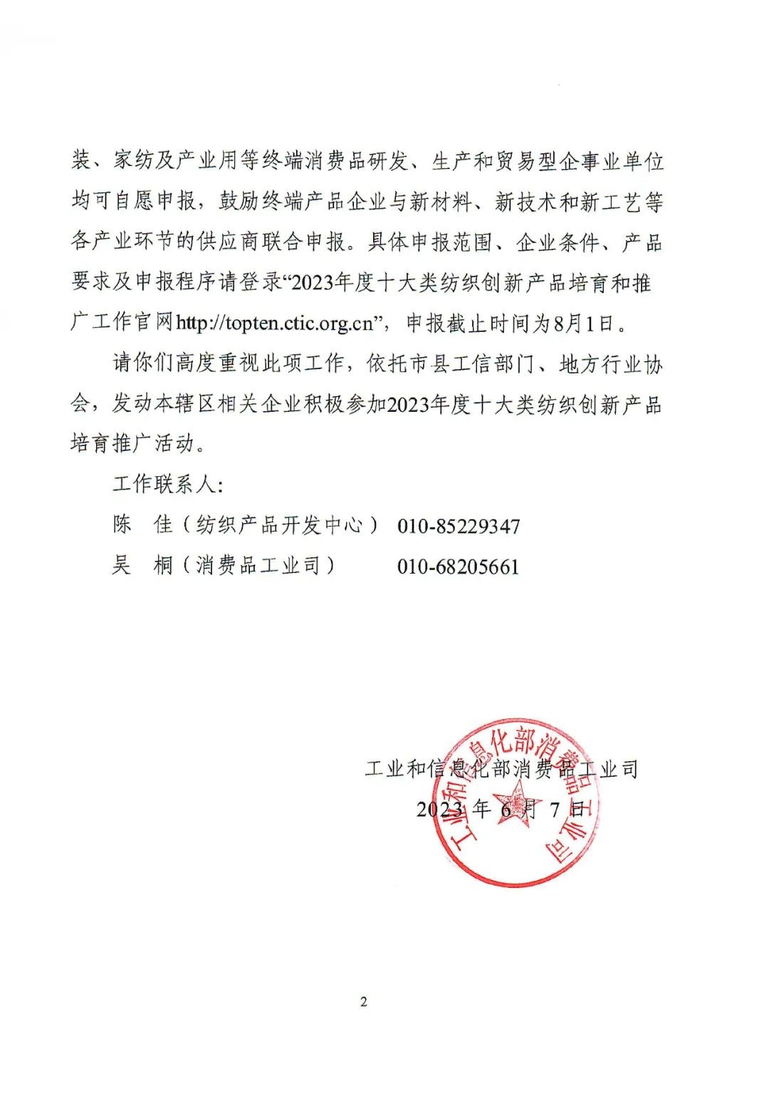 为进一步推动纺织行业增品种、提品质、创品牌,引导广大企业注重产品创新,服务广大企业开拓市场,工业和信息化部消费品工业司下发了“关于开展2023年度十大类纺织创新产品培育和推广工作的通知”。网上申报工作将于8月1日截止。