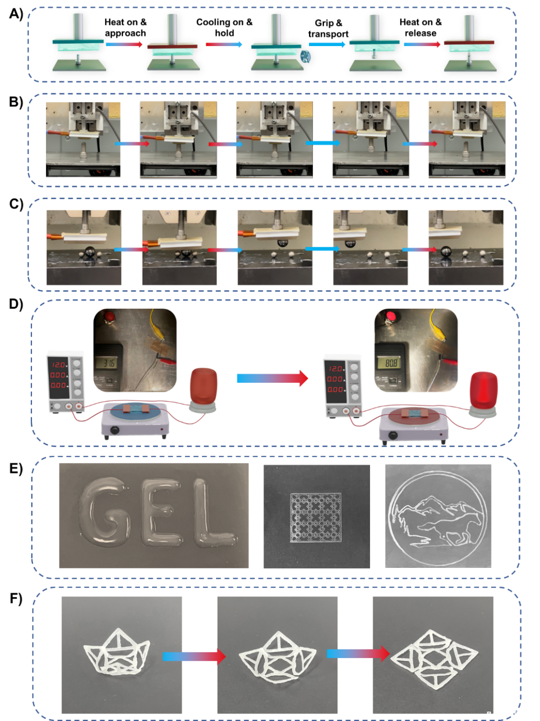 PS-NCC离子凝胶还具有热响应的刚性及导电性可变功能,能够组装成热响应抓手以及温度报警装置。并且该离子凝胶的前驱体溶液具有剪切变稀特性,能够利用3D打印出复杂的图案和结构。此外,离子凝胶中的IL可以通过溶剂交换来实现回收,且离子凝胶可以被自然环境中的土壤降解,进一步丰富了其实用性和可持续性。