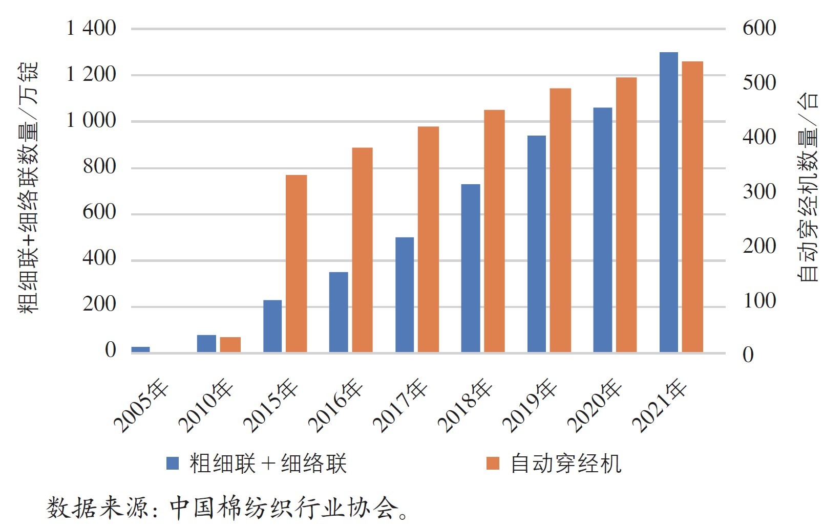 2005 — 2021年我国棉纺织智能制造关键设备的用量