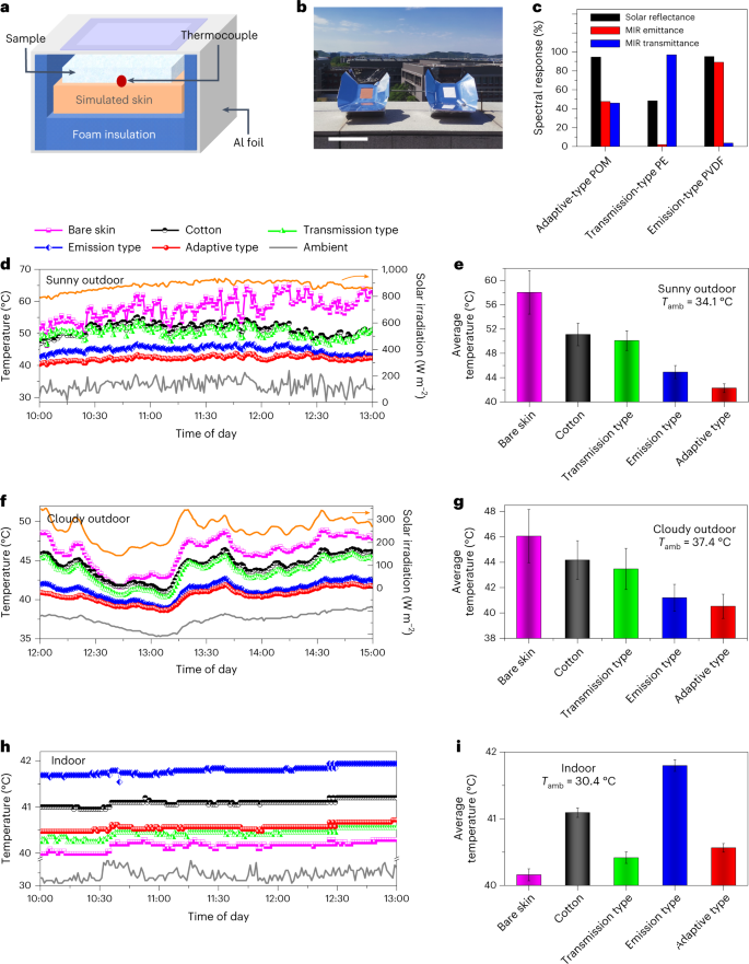 研究人员在我国南京炎热夏季的三种典型环境中测试了POM纺织品的全天候辐射人体冷却性能,包括晴朗的室外、阴天的室外和室内环境。结果表明,在室外环境中(晴天和阴天环境),POM织物覆盖的皮肤模拟器在五个样品(裸露皮肤、棉织物、透射型纺织品、发射型纺织品、自适应型纺织品)中具有最低的表面温度,对人体表现出最佳的户外冷却性能。