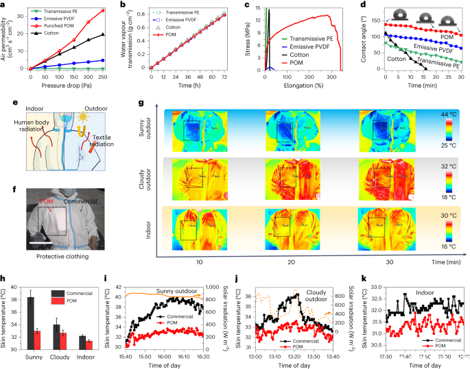 除了优越的辐射冷却性能外,POM纺织品还表现多项服用性能指标,包括出色的耐磨性能、良好的透气性、机械强度、防水性和防潮能力。其具有13.3MPa的高拉伸强度,水接触角达到138°,半小时后保持在122°,远高于其他三种纺织品。在各种户外环境中,POM纺织品的辐射冷却性能比商用防护服显著增强,且具有更好的室内冷却性能,商业化潜力很高。