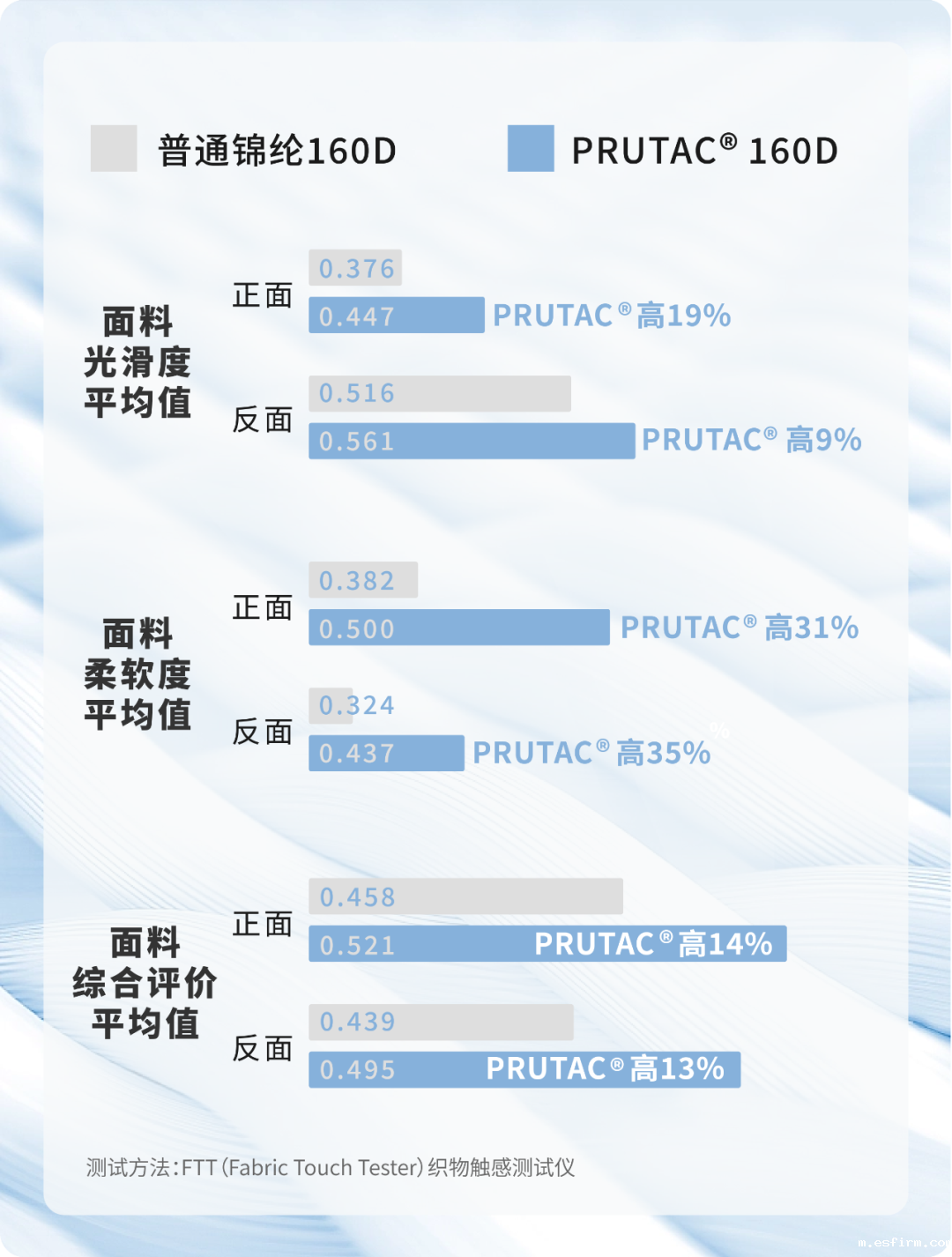 根据FZ/T 01166-2022《纺织品织物触感检测与评价方法:多指标集成法》测试标准,锦纶66 PRUTAC®织物光滑度和柔软度明显优于普通锦纶,整体触感更加舒适。