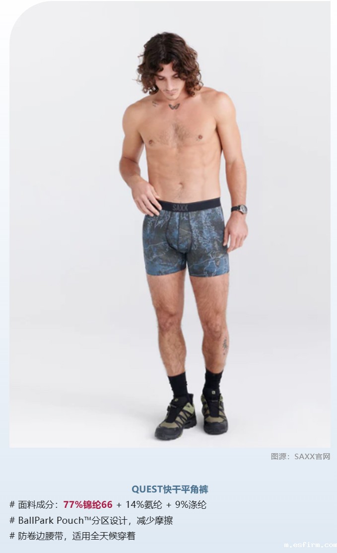 《国家地理杂志》将SAXX Quest系列快干平角裤誉为“最出色的旅游用内衣”(the ultimate travel underwear)。吸湿排汗的舒适面料、功能性创新设计,为消费者提供绝佳的舒适体验,适合全天候穿着。