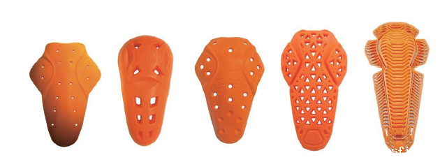 近来,仿生学也给予了防护装备新的设计理念。像穿山甲、龙虾等动物会通过坚硬的外壳来保护内部柔软的身体,品牌Dainese就曾借鉴该类元素来设计护背;在其最近的设计中,分形(fractals)概念开始被借鉴,以创建更为复杂精巧、防护性能更好的护背产品。分形结构的设计中引入了较多的镂空,在某种程度上能减重减负,改善其在低温条件下的弯折性,并且有助于散湿散热。