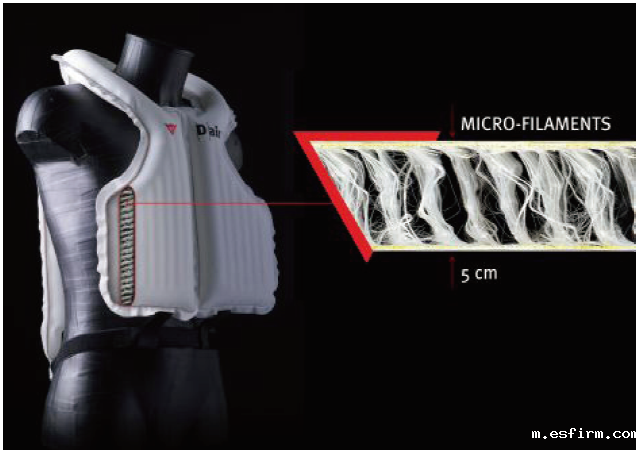 Dainese还是第一个将集成安全气囊系统引入防护装备的品牌,其最负盛名的产品当属D-air安全气囊系列。在高速碰撞中,事故的发生通常会在0.08s内结束,而D-air安全气囊宣称可以在0.05s内完全展开。在其2019年发布的Smart Jacket中,Dainese披露了D-air安全气囊的一些最新技术细节。该技术的关键在于如何在事故发生的瞬间完成充气,并有效吸收、化解强大冲击能量。在D-air系列产品的内部交织了数以百万计相连的细丝组织,撞击的瞬间气瓶中的气体会被充入细丝组织内,而且这种集成的微结构可以确保整个表面的膨胀是均匀且可控的,因此气囊表面会保持均匀的压力,使气体不会因受压而流走。目前,这种安全气囊的相关专利技术仅被Dainese和Alpinestars两家防护装备领域的巨头所掌握。