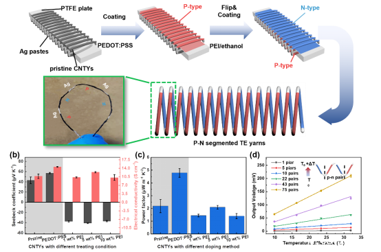 近日,苏州大学研究团队通过简单的两步浸渍工艺在传统棉纱的基础上制备了具有高热电性能的碳纳米管复合纱线,并在此基础上构建了柔性热电织物,实现了从人体热能到电能的有效转化。