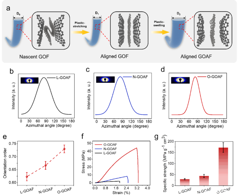 塑化溶胀法可以使制备的气凝胶纤维保持其前驱体固态氧化石墨烯纤维的取向度,从而可以获得高取向的气凝胶纤维,相比于传统液晶纺丝法,取向度的提高强化了氧化石墨烯多孔网络的搭接强度,提升了其力学强度。