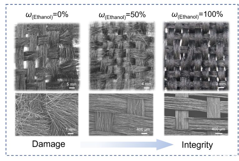 研究人员基于成熟塑化拉伸技术制备了高取向的氧化石墨烯纤维,并将纤维丝束编织成织物,通过溶剂进行塑化溶胀,对溶胀的氧化石墨烯凝胶纤维织物进行预还原、冷冻干燥和高温还原处理,最终获得石墨烯气凝胶纤维织物。