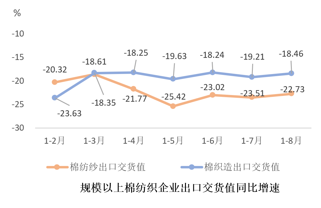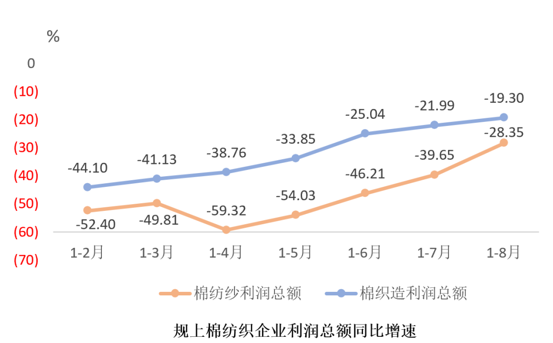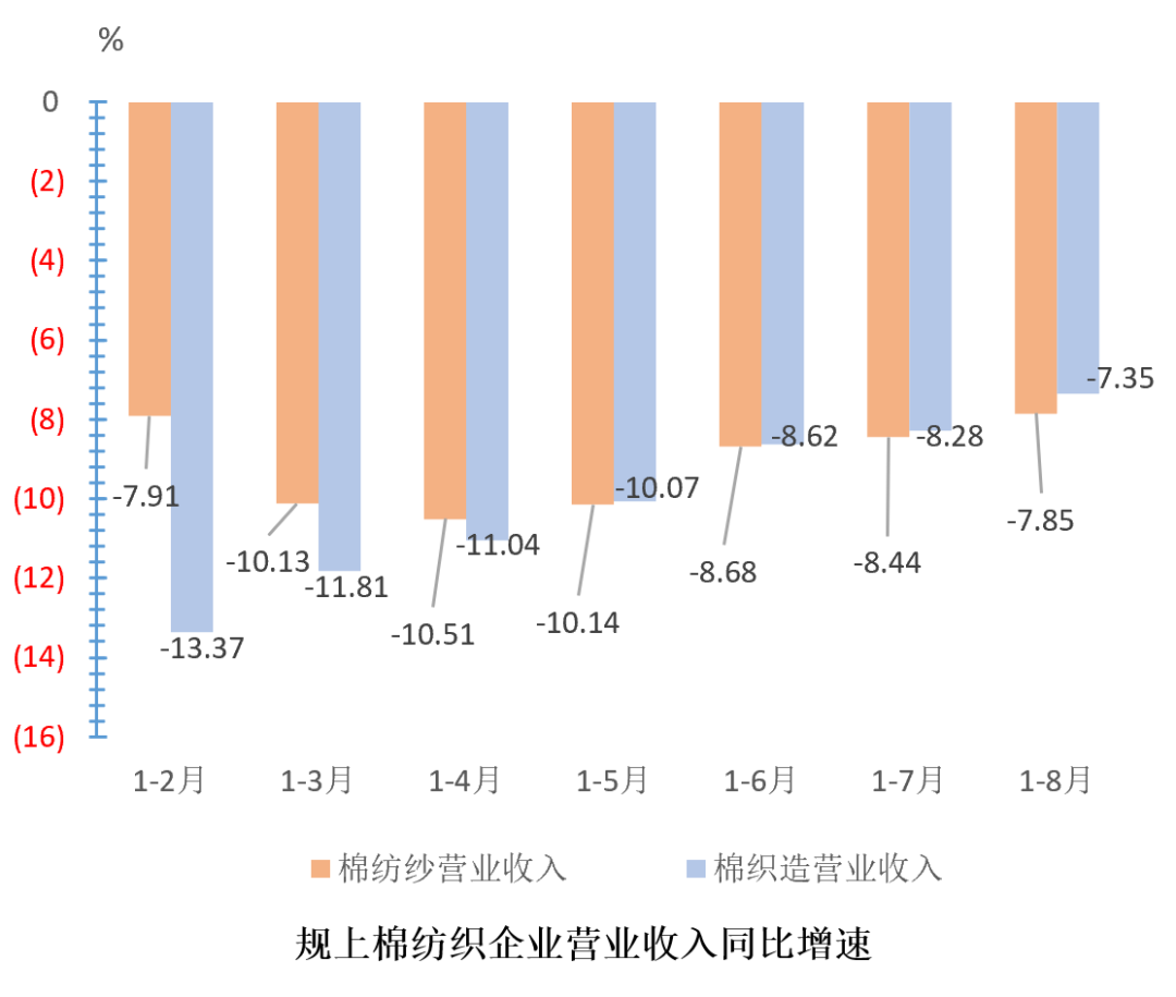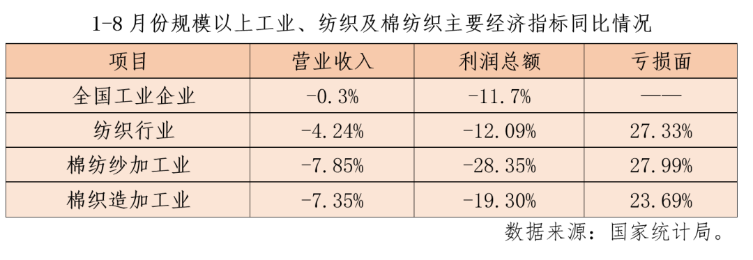 棉纺织行业主要经济指标降幅收窄,企业效益逐步改善。据国家统计局数据,1-8月份,规模以上棉纺纱企业营业收入同比下降7.85%,降幅较1-7月份收窄0.59个百分点,利润总额同比下降28.35%,降幅较1-7月份收窄11.3个百分点,亏损面27.99%,较1-7月收窄0.58个百分点;棉织造企业营业收入同比下降7.35%,降幅较1-7月份收窄0.93个百分点,利润总额同比下降19.30%,降幅较1-7月份收窄2.69个百分点,亏损面23.69%,降幅较1-7月份收窄0.3个百分点。但是,规模以上棉纺纱和棉织造业营收和利润指标均显著弱于全国规模以上工业企业和纺织行业,亏损面仍处于较高水平。