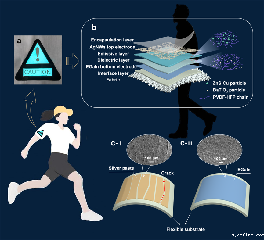 受到纺织数码喷墨印花技术的启发,浙江理工大学胡毅教授团队提出一种简单的全喷涂方法在纺织品上制造ACEL器件。所制备的ACEL器件由织物、界面层、共晶镓铟合金(EGaIn)底电极、介质层、发光层、银纳米线(AgNWs)顶电极和封装层组成。具有本征流动性的EGaIn能够顺应器件的形状变化,有效抵抗裂纹扩展,大大提高了其抗机械变形的电稳健性。