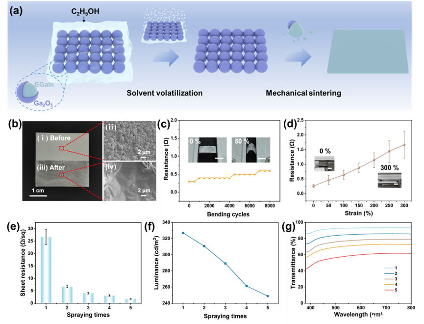EGaIn颗粒经过“机械烧结”后在TPU膜上得到很好的铺展,制成了具有良好均匀性的EGaIn电极;通过喷涂方法将AgNWs导电网络沉积在发光层上,以建立透明的顶电极;介质层是由PVDF-HFP和分散在其中的高介电常数BaTiO3纳米颗粒组成的复合材料,通过喷涂均匀沉积在底部电极上,可以防止器件被击穿;发射层是将ZnS∶Cu荧光粉分散到PVDF-HFP聚合物基体中,然后用喷枪将其沉积在介电层上制成的。