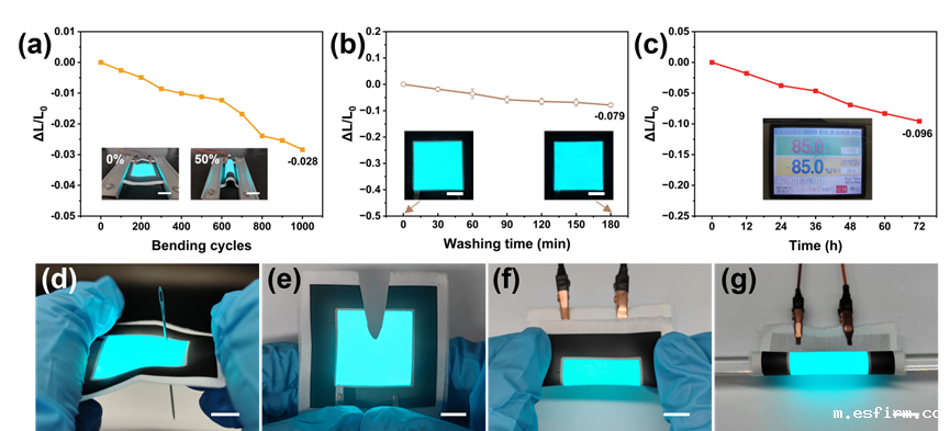 所制备ACEL器件表现出优异的耐久性,在弯曲、针刺、剪切、折叠和卷曲,甚至剧烈摩擦下都能正常工作。测试结果显示,在压缩比为50%的情况下弯曲1000次后,柔性ACEL器件的发射强度仅下降2.8%;在60℃下的标准洗衣机中连续洗涤180min后,器件亮度下降约7.9%,但不破坏发光均匀性;当暴露在高温高湿条件下72h后,设备亮度仅下降9.6%。
