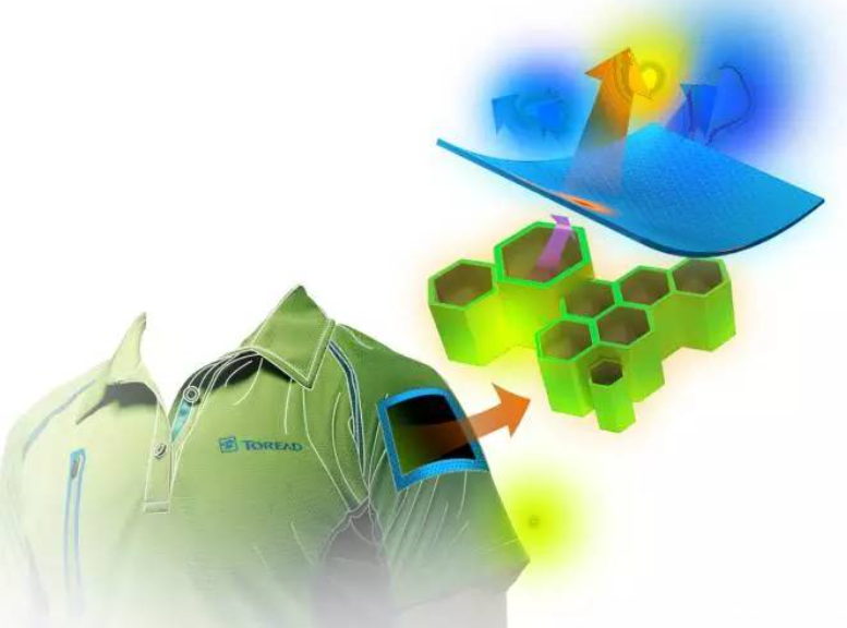在应用实例方面,探路者TiEF DRY单向导湿科技面料仿生泵吸导湿速干面料,通过模拟植物叶片气孔的泵吸原理,进行双层微结构织物设计,内层利用特殊纤维及纤维表面单向导湿助剂网格涂层整理形成微细气孔,外层与内层以特殊编织方法形成泵吸通道,使皮肤汗液经气孔泵吸作用迅速传导至面料表面,从而加快汗液扩散与蒸发,保持面料与人体肌肤间始终舒适干爽。