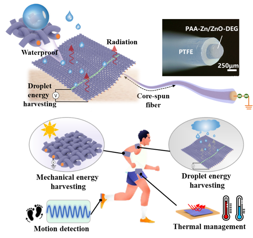 基于上述思路,该研究团队制备了一种以锌基共晶凝胶(DEG)为芯层、聚四氟乙烯为鞘层的芯纺功能纤维(CSF)。CSF实现了压电增强摩擦电的协同输出,同时具有优异的疏水性,以及较高的中红外发射率和可见光反射率。由CSF编织而成的单层多功能集成纺织品可实现有效的可穿戴能量(机械能和液滴能)收集和个人热管理功能。