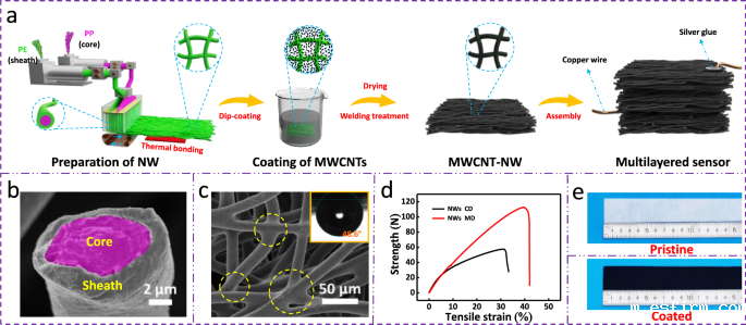 研究人员以聚乙烯(PE)切片和亲水性切片(含量为5 wt.%)为鞘层,聚丙烯(PP)切片为芯层,将工业化纺丝成网与热风粘合技术相结合制备了亲水性PP-PE双组分纺粘非织造材料(PP-PE NWs),再通过浸渍方法和原位热焊接技术将CNT网络固定在PP-PE纤维的表面,多层叠加制备出3D全织物压阻传感器。PP-PE纤维的芯鞘截面结构经热风处理后,相邻纤维间形成了粘合点,呈现出良好的机械性能,满足可穿戴压阻传感器的需求。