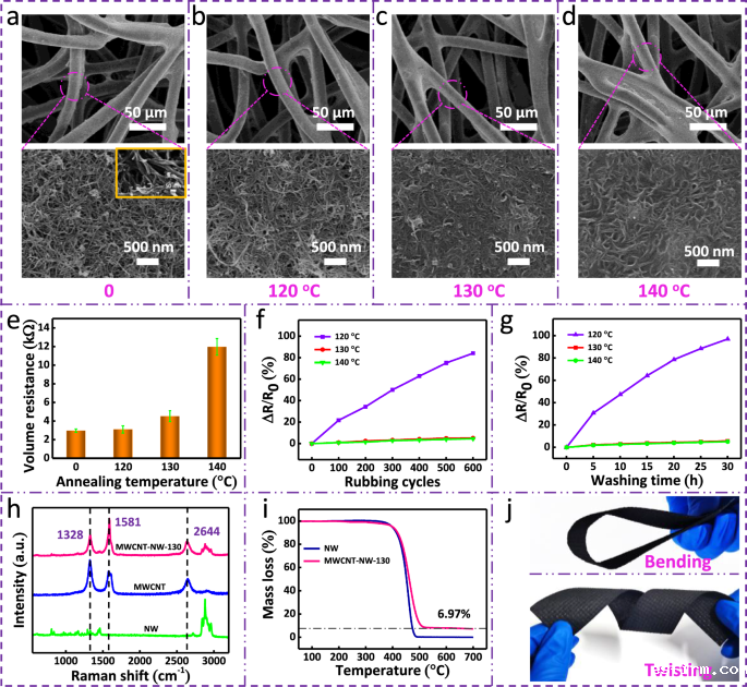 研究发现,热焊接温度低(120 ℃),CNT难嵌入PP-PE纤维,导致CNT/PP-PE NWs的耐摩擦和耐水洗色牢度差;热焊接温度过高(140 ℃),使大部分PE与CNT导电网络混合,耐摩擦和耐水洗色牢度强,但绝缘性的PE会阻隔CNT网络的相互连接,导致CNT/PP-PE NWs的电阻明显增大。因此,130 °C为最佳热焊接温度。