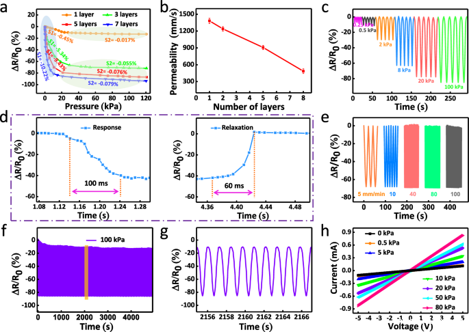 研究人员发现当CNT/PP-PE NWs的数量从1增至7时,传感器的灵敏度明显提高,透气性从1382.12 mm/s降低至465.57 mm/s。为了准确获取人体的生命活动,当设定CNT/PP-PE NWs的层数为5时,传感器显示出高灵敏度,良好的透气性,优异的稳定性。