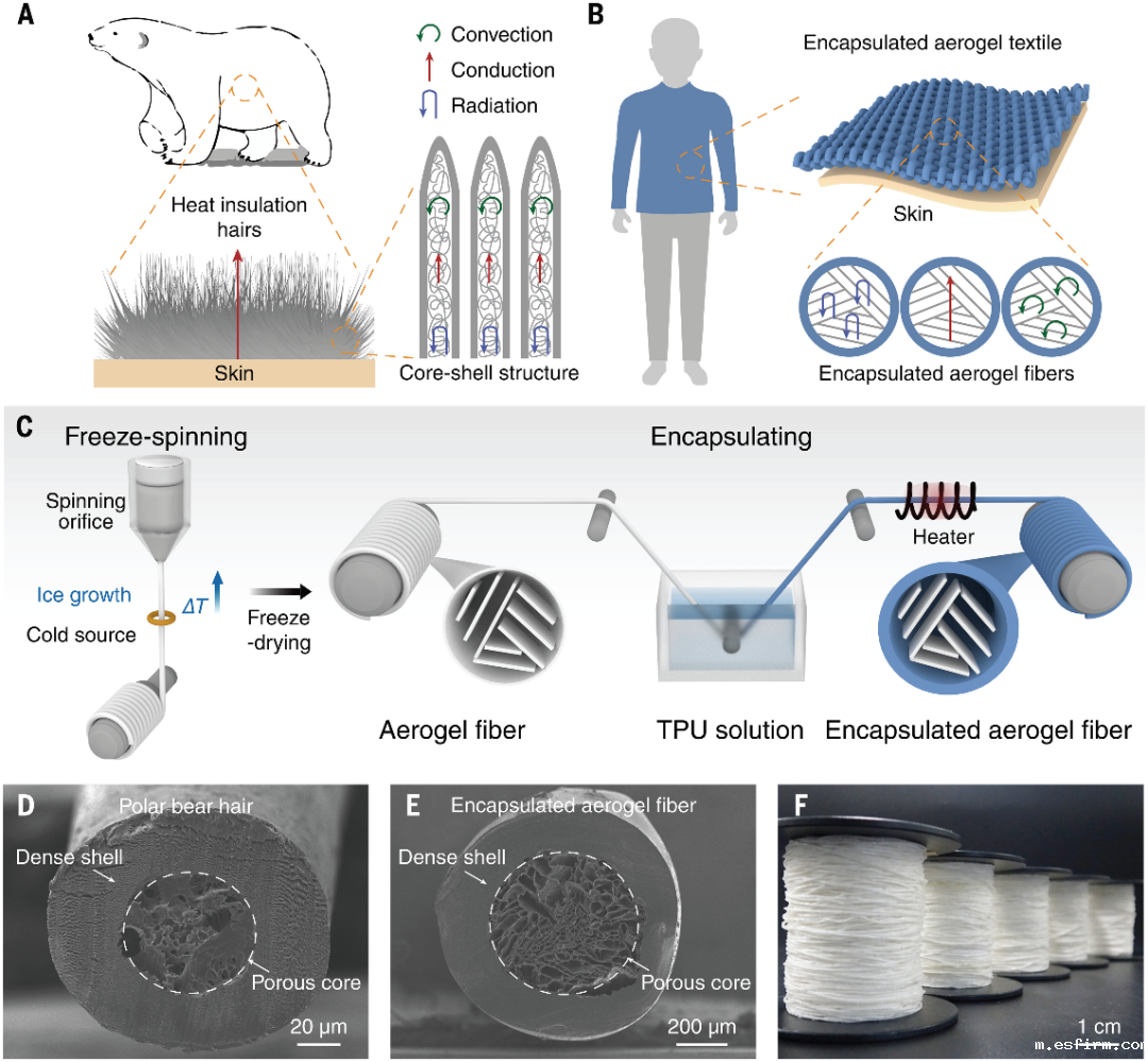 北极熊毛具有多孔核心和致密外壳结构,可防止热量流失(图 1A)。北极熊上的微米孔隙能够捕获大量静止空气,有效地阻止热传导和对流。排列整齐的多孔壁大大减少了导热路径,并提供强大的红外线(IR)反射率,这都有利于有效隔热。致密的外壳保护着多孔内核,使毛发防水且对潮湿空气不敏感。