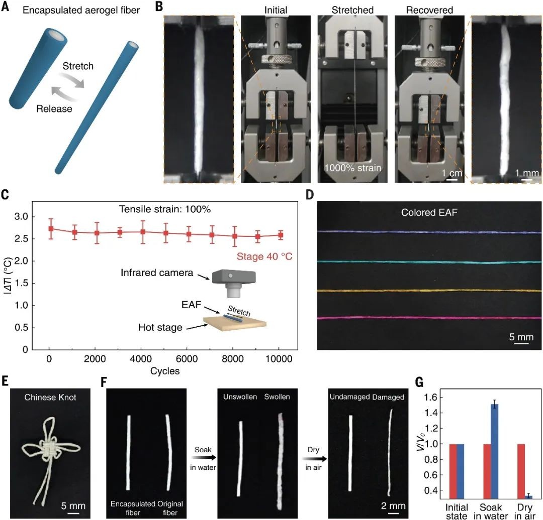 在机械性能方面,加入致密封装层后,气凝胶纤维变得非常坚固且可拉伸。随着封装层厚度的增加,纤维的拉伸强度从 2.3 MPa增加到 12.7 MPa,而伸长率则从 24% 增加到 1600%。虽然EAF 核心结构在拉伸过程中可能会断裂,但封装层仍保持连续,这确保了 EAF 结构的完整性和功能的稳定性。
