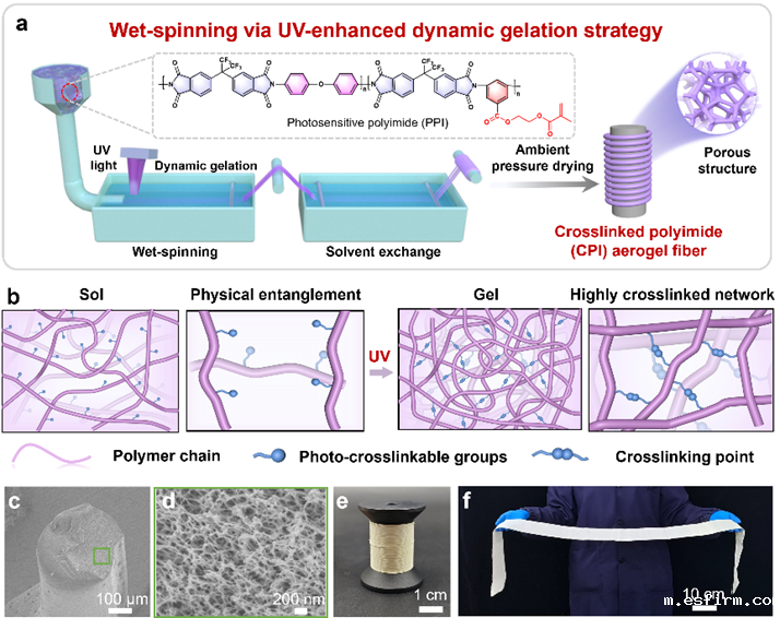 研究人员合成了一种侧链上含有不饱和双键的有机可溶性光敏聚酰亚胺纺丝液,其通过喷丝头挤出后,在紫外增强动态凝胶策略下,随机分布的分子链在紫外线照射下快速交联形成高强度的凝胶网络,通过溶剂置换和常压干燥制备了CPI气凝胶纤维。其快速凝胶化过程和常压干燥为快速、连续和大规模地制备CPI气凝胶纤维提供了可能性。