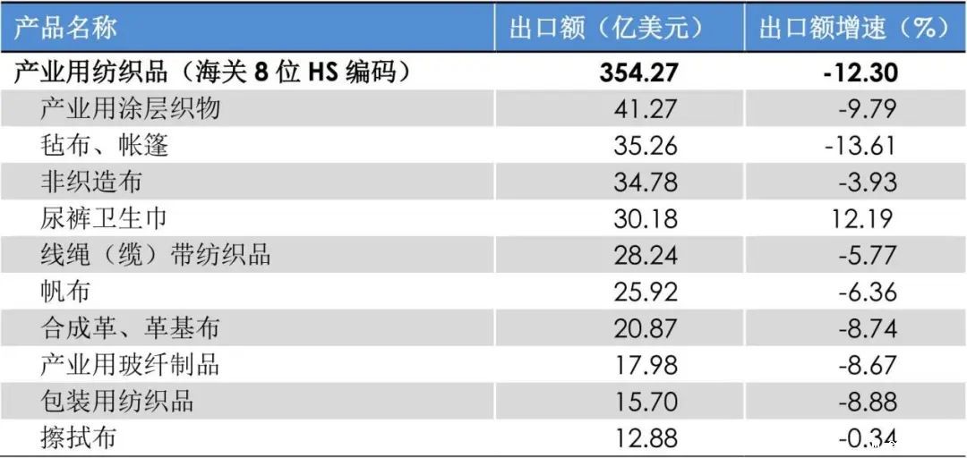 国际贸易方面,根据中国海关数据,2023年1-11月我国产业用纺织品行业的出口额(海关8位HS编码统计数据)为354.3亿美元,同比下降12.3%;1-11月行业进口额(海关8位HS编码统计数据)为48亿美元,同比下降15.2%。分产品来看,产业用涂层织物、毡布/帐篷是目前行业的两大出口产品,产业用涂层织物的出口额突破40亿美元,达到41.3亿美元,毡布/帐篷的出口额为35.3亿美元,同比下降13.6%;非织造布的海外需求持续回暖,出口量为119.6万吨,同比增长8.3%,出口额为34.8亿美元,随着出口单价的回升,非织造布的出口额降幅收窄至3.9%;一次性卫生用品(尿裤、卫生巾等)海外市场保持活跃,出口额达到30.2亿美元,同比增长12.2%;传统产品中,革基布、产业用玻纤制品、包装用纺织品的出口额降幅有所收窄,线绳(缆)带纺织品、帆布的出口额降幅有不同程度的加深;擦拭布(不含湿巾)的出口额为12.9亿美元,同比下降0.3%。