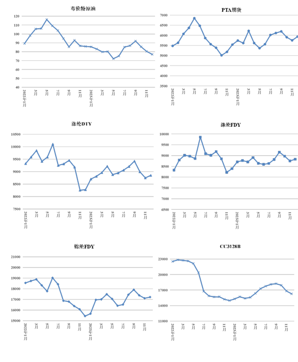 图4 2022年1月~2023年12月我国化纤长丝、棉花、PTA期货及布伦特原油价格走势