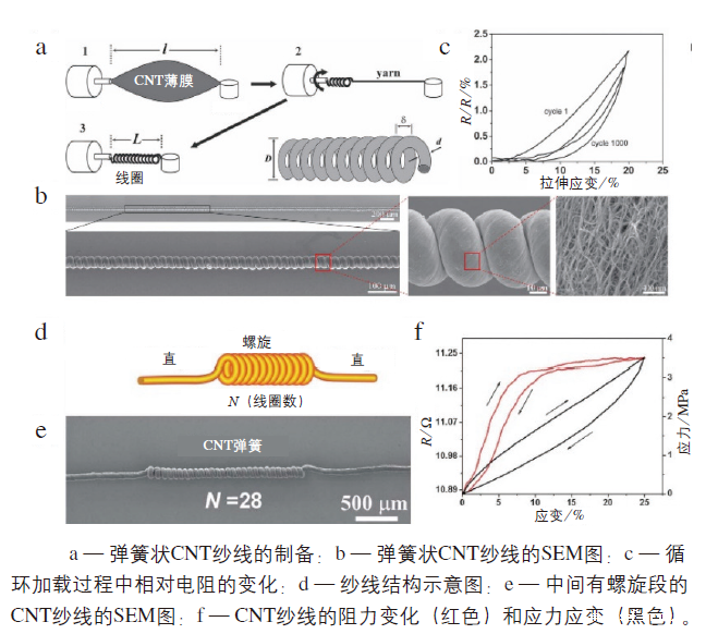 利用碳纳米管(CNT)薄膜的高柔性,研究人员等提出了一种弹簧状CNT纱线的可控制造方法。该纱线的弹簧状圆弧排列均匀,在微观条件下可以观察到纱线内部的CNT纤维束具有轻微取向性。在拉伸期间,由于“弹簧”的展开和拉直而表现出突出的高达285%的应变拉伸性,断裂韧性也高达28.7 J/g。更重要的是,这种CNT纱线的电导率在初始状态下接近440 S/cm,并且在重复加载循环之后没有下降。随后,研究团队修改了旋转策略,精确控制了环的位置和数量,成功制备了部分螺旋结构。与全螺旋结构相比,部分螺旋结构在高达25%的应变下表现出更好的弹性以及线性电阻-应变关系。