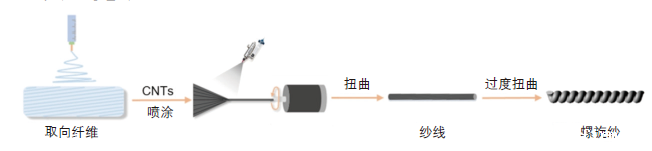 另一方面,研究人员等利用静电纺丝和喷涂的方式,制备了超高可伸缩导电螺旋纱。首先通过静电纺丝法制备PU纳米纤维,并将其收集在一个旋转的圆筒形接收器上。收集到的纳米纤维膜被切成条带状,随后将CNTs/乙醇悬浮液喷洒在条带上,喷涂后,将CNTs/PU纳米纤维复合条带扭曲成纱线,然后再进一步过度扭曲形成螺旋纱线。在软聚合物链、纳米纤维螺旋结构的协同作用下,CNTs/PU螺旋纱线打破了固有刚性对材料可弯曲性的限制,不仅表现出与直纱相似的高强度,而且表现出极高的拉伸能力,应变接近1900%,同时具有稳定的电导率和回复能力,在智能可穿戴纺织品、大应变传感器、软机器人等方面的竞争潜力巨大。
