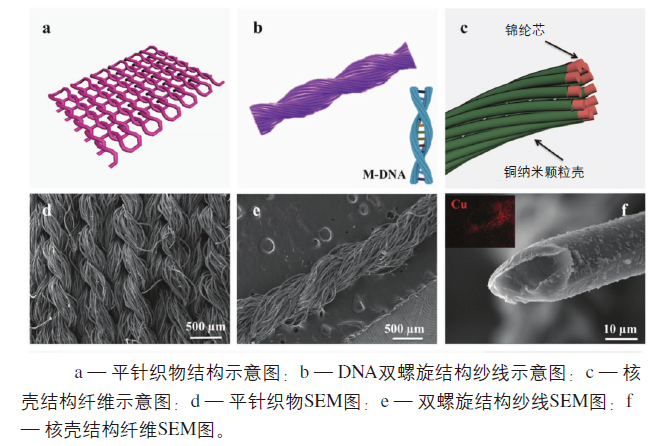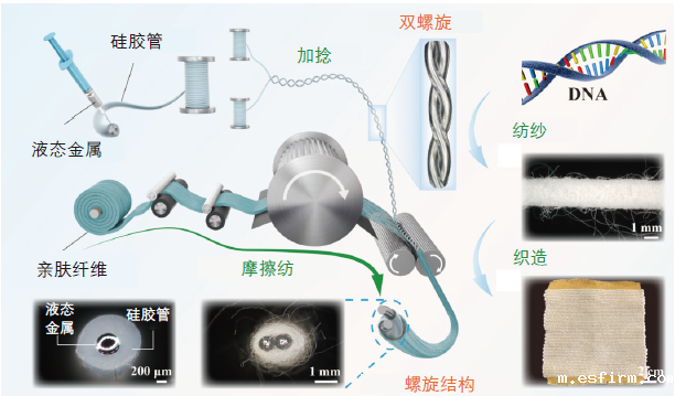 另有研究人员采用环锭纺和摩擦纺丝技术,制备了一种具有新型分层结构的柔性、可拉伸、导电的双螺旋结构纱。为使纱线具有稳定的导电性,研究者将液态金属注入硅胶管中,随后其被进一步加捻形成双螺旋纱。然后,将加捻后的硅胶管作为芯纱放入商用摩擦纺纱机中,利用摩擦纺的方式将锦纶包裹在其外部,该方式可以大量生产连续纱线(超过600 m)。螺旋-核壳的特殊结构,使这种纱线具备良好的导电性、耐久性、透气性、稳定性,能够用于人体运动监测、能量采集等,该成果有助于促进纺织可穿戴设备在医疗保健、人工智能和软机器人等领域的快速应用。