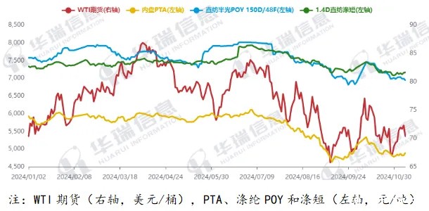 图3 2024年以来国际油价、PTA、涤纶POY、涤纶短纤价格走势