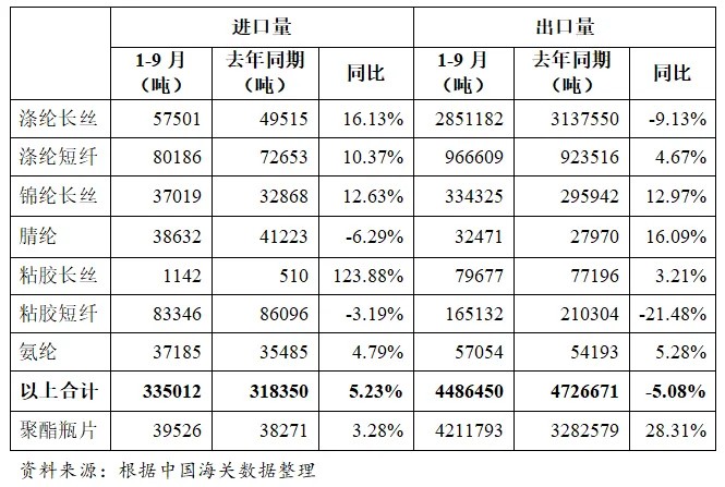表2 2024年1-9月化纤主要产品进出口情况