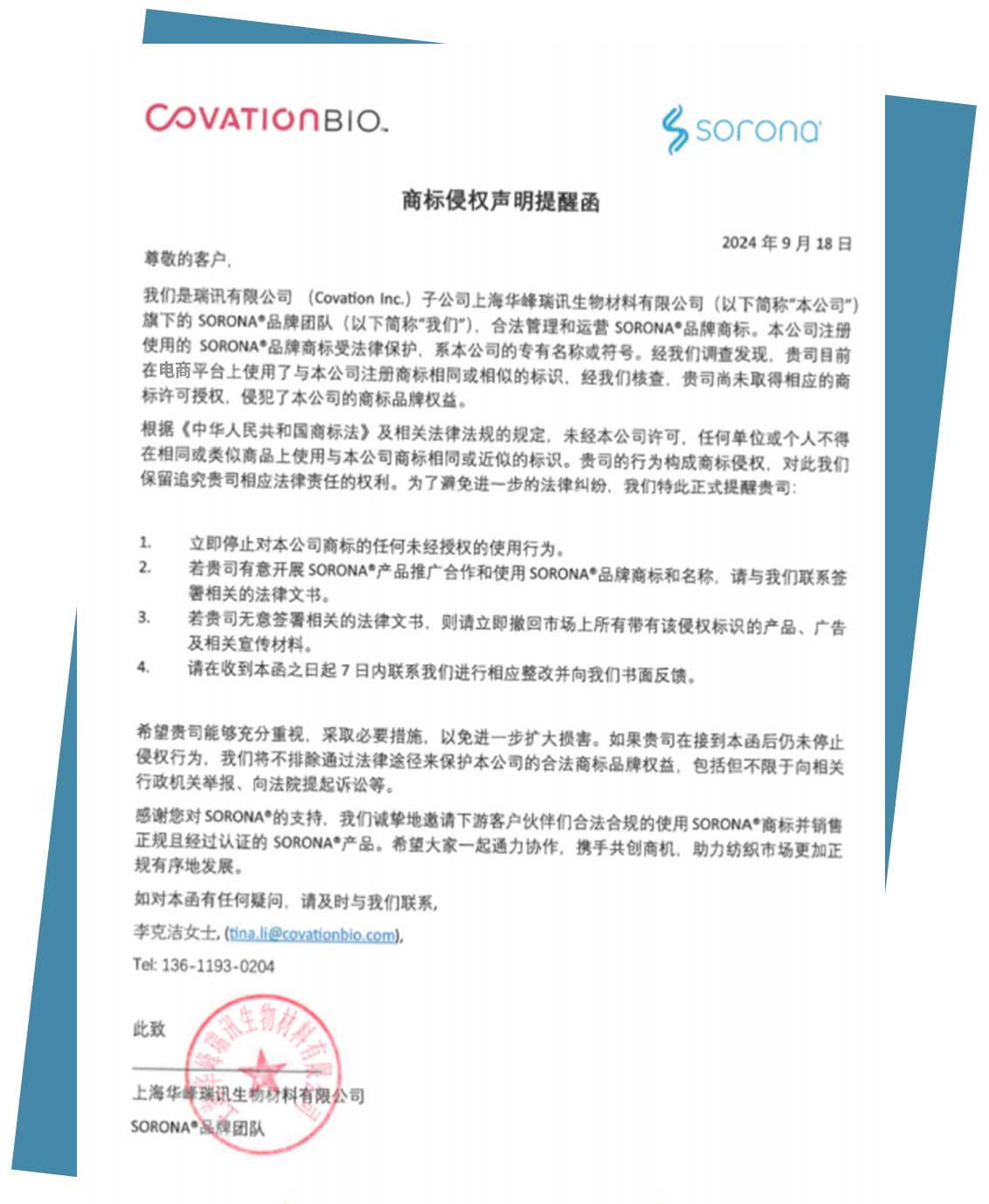 瑞讯生物材料已于今年下半年启动在电商平台上使用SORONA®商标的相关规范管理工作,以加强品牌管理和保护客户权益。对于商标侵权和不正当竞争的行为,瑞讯生物材料将逐步收集相关侵证据并进行证据保全,通过多种方式要求侵权方下架,展示维护SORONA®品牌的决心。此举措亦旨在制止当前仿冒SORONA®吊牌泛滥于市场的现象,保护SORONA®下游真实商家的合法权益。