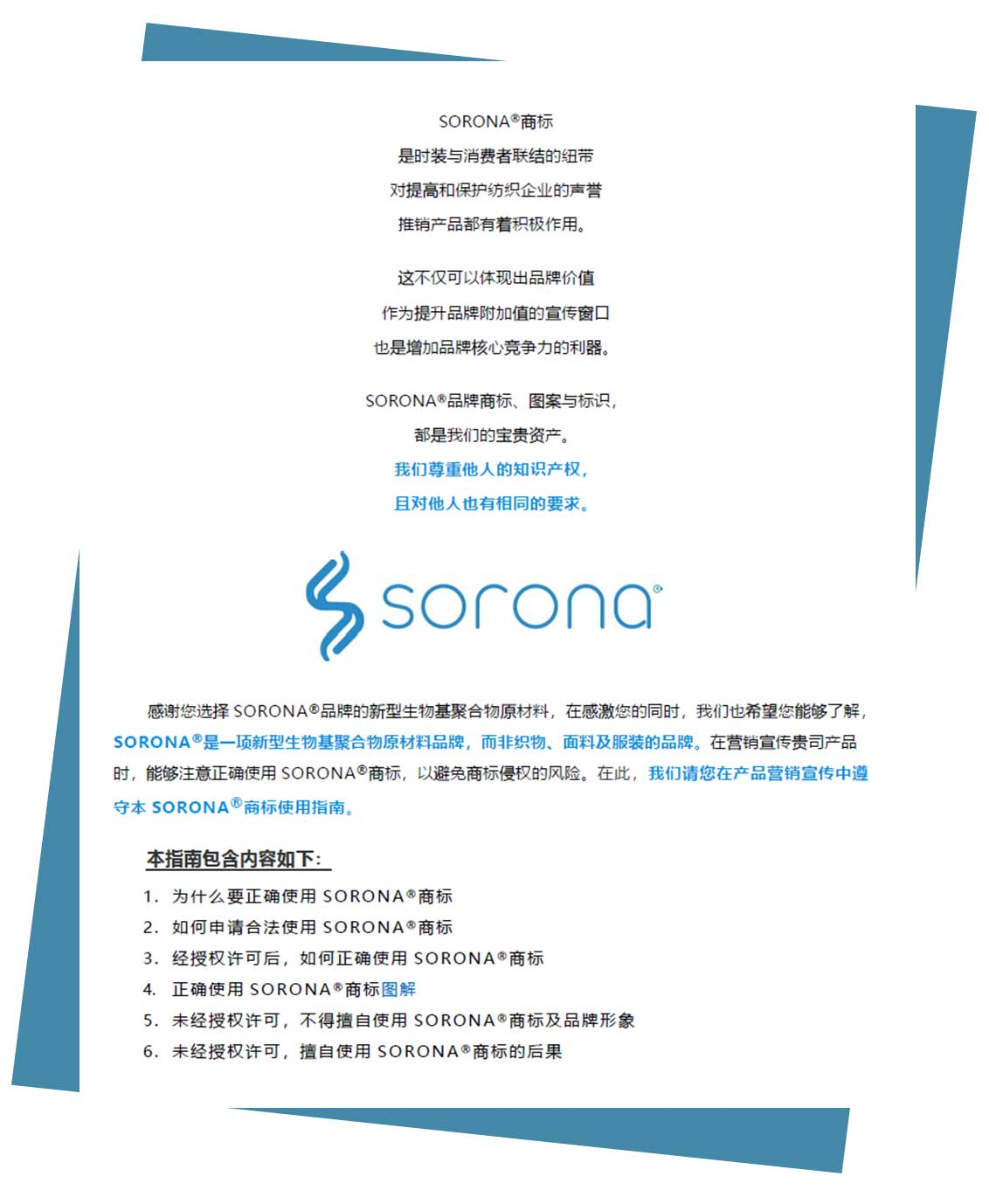 未经获得书面许可,任何公司和实体都不得在工业用化学品、纤维、纱、线、服装、地毯等商品类别上使用SORONA®商标标识。即使您在SORONA®授权经销渠道购买并使用了SORONA®品牌材料,如未获得瑞讯生物材料直接授权,任何人不得在产品宣传和介绍中使用 SORONA®名称及商标形象,不得有损SORONA®品牌形象,或出现误导公众的现象。所有含有SORONA®商标标识的营销推广资料需要先经SORONA®团队审核通过后方可使用。