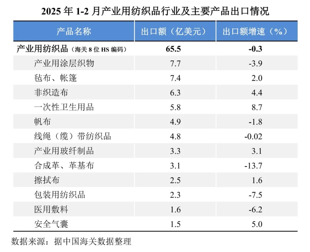 国际贸易方面,根据中国海关数据(海关8位HS编码统计数据),2025年1-2月我国产业用纺织品行业的出口额为65.5亿美元,同比下降0.3%;1-2月行业进口额为8亿美元,同比增长9.1%。