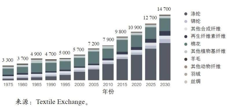 全球纤维产量发展趋势(1975 — 2030年) 万t