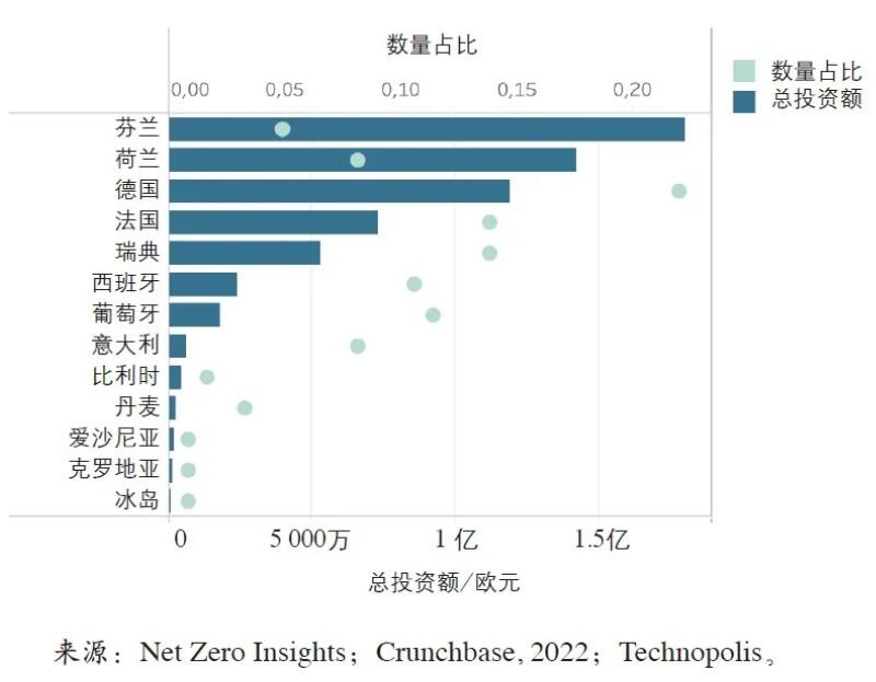 2014—2021年,欧洲地区约82%针对绿色纺织的风险投资额以及私募股权投资集中于芬兰、荷兰、德国和法国;从被投资的企业数量来看,德国、瑞典、法国、葡萄牙和西班牙位居前五。