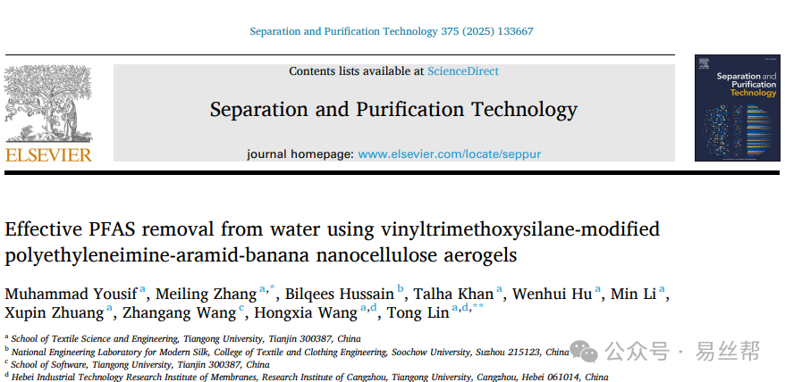 天津工业大学纺织科学与工程学院张美玲/林童教授团队开发了一种基于表面改性香蕉茎秆纳米纤维素的气凝胶吸附材料,可高效去除水体中的全氟与多氟烷基物质(PFAS)。研究团队通过复合聚乙烯亚胺(PEI)和芳纶纤维,并经乙烯基三甲氧基硅烷(VTMS)疏水化改性,构建出高比表面积的仿生分级孔结构。该材料具有超高效吸附性能:在120~180分钟内将多种PFAS(PFOS、PFNA、PFHxS、PFBS等)从初始浓度1000 ppb降至2.87 ng/L(ppt),远低于EPA 2024年饮用水限值标准(如PFOS限值为4 ng/L);具备广谱吸附优势:对长链PFAS(如PFOS、PFNA)的去除率>99.9%,显著优于传统活性炭与MOFs材料;同时还具有卓越的循环稳定性:经15次吸附—脱附循环后仍保持92.3%的吸附容量,展现出优异的机械与化学稳定性。相关成果以“Effective PFAS removal from water using vinyltrimethoxysilane-modified polyethyleneimine-aramid-banana nanocellulose aerogels”为题,发表在环境领域Top期刊《Separation and Purification Technology》上。