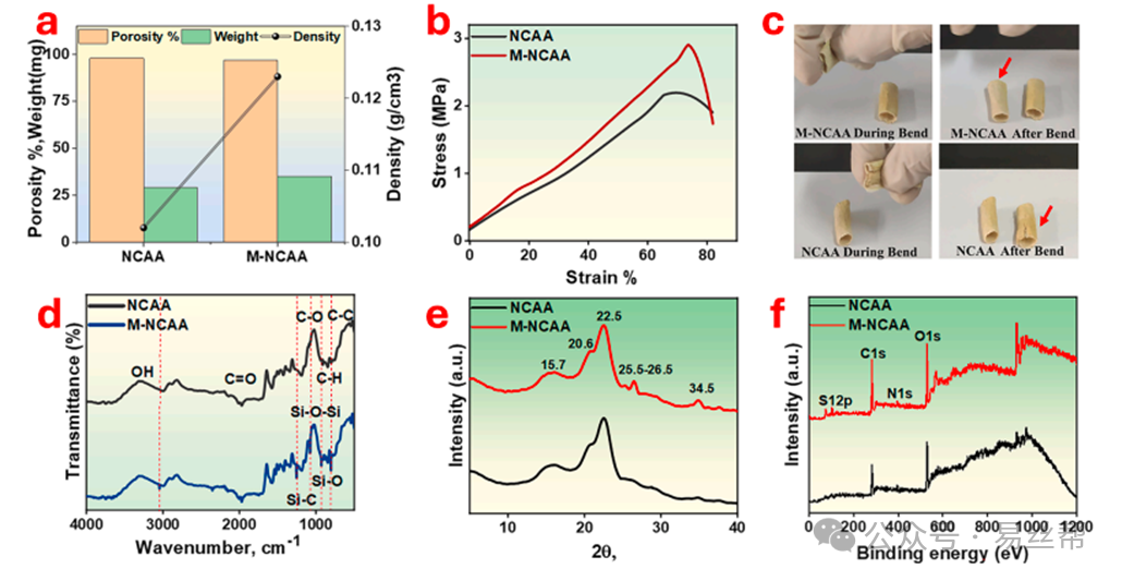 该团队通过冷冻干燥和表面化学改性技术,成功制备出具有多孔结构的NCAA和M-NCAA气凝胶。SEM图像中显示该气凝胶具有优异的孔隙结构和孔连通性。FTIR、XPS与XRD测试证明了VTMS的成功接枝,增强了材料的疏水性和结晶性。力学性能测试显示M-NCAA具备更高的强度与形变恢复能力。