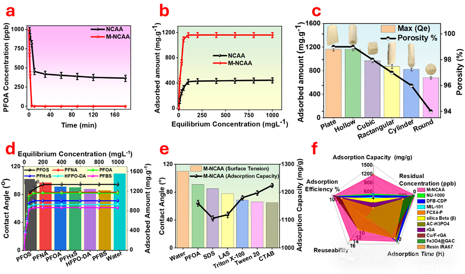 在初始浓度为1000 ppb的PFAS溶液中,M-NCAA在2~3小时内即可将各类PFAS浓度降至2.87~8.9 ppt,其最大吸附容量达到1337 mg/g(以PFOS为例),显著优于未经改性的NCAA。不同形貌结构(中空、片状、球形等)材料的吸附效率存在差异。在水中加入非离子或阳离子表面活性剂可提升材料的PFAS吸附能力,而阴离子则会降低其吸附性能。材料对PFAS展现出广谱吸附特性,Langmuir模型拟合证实了单层化学吸附过程。