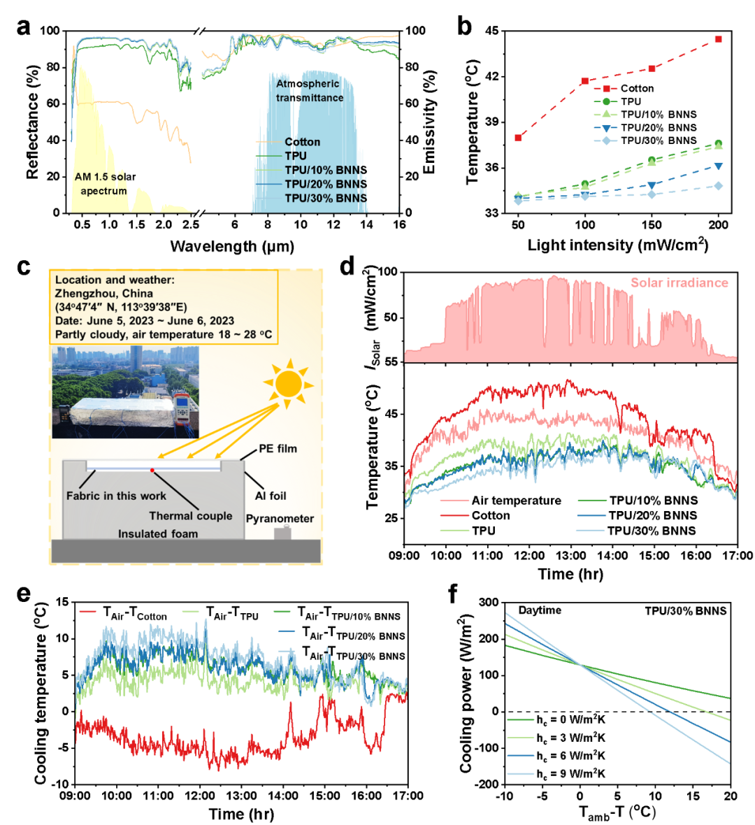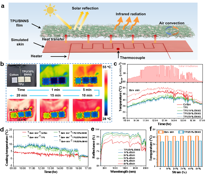 图5. TPU/BNNS复合织物的日间冷却性能及其机械自适应特性